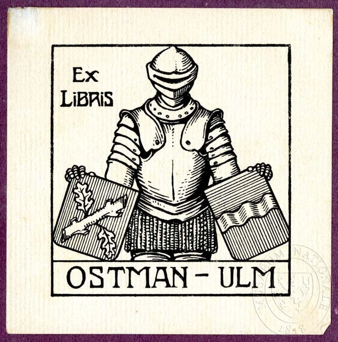 Exlibris. Alianční erby rodiny Ostman-Ulm. Novodobý tisk. Popis erbů : rytíř držící dva štíty - červený štít s dubovou ostrví - rod Ostman a vlnitým břevnem půlený modro červený štít. EX LIBRIS OSTAMN.