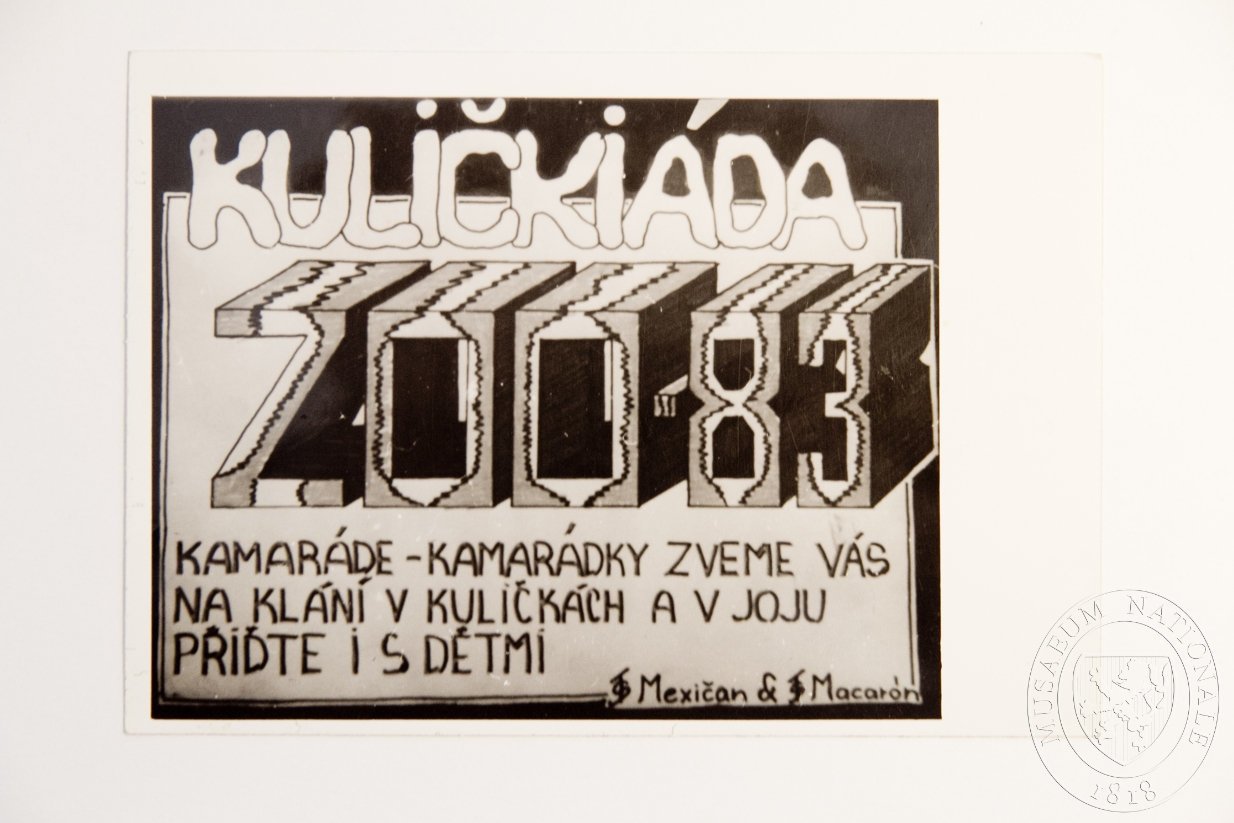Kartička - zvadlo. Graficky upravený text pozvání na kuličkiádu ofocený na lesklý papír. Podpisy pořadatelů v pravém dolním rohu jsou na rozdíl od dalšího exempláře vcelku.