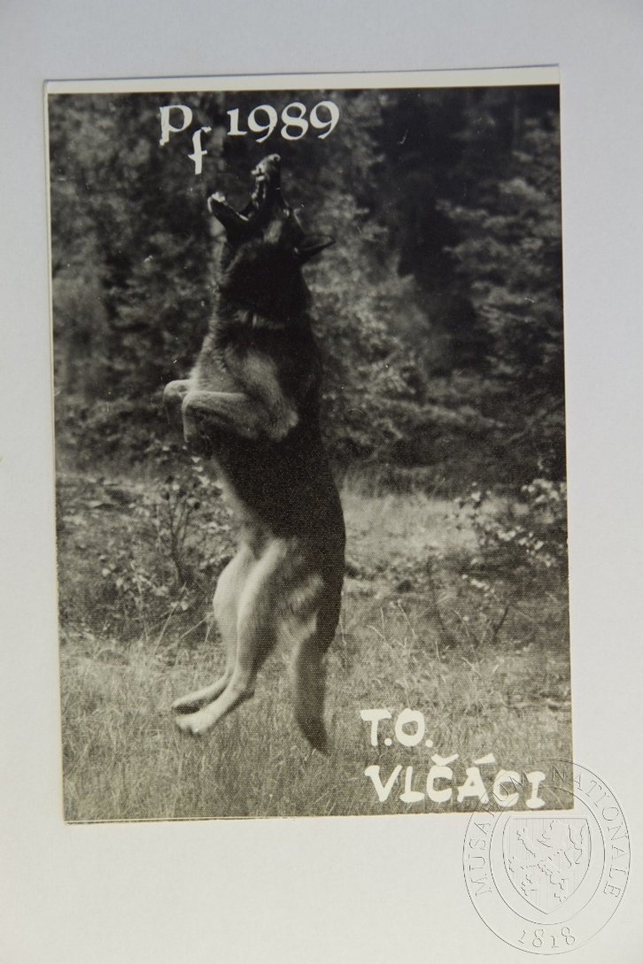Novoročenka - fotografie vlčáka ve skoku. Lesklý papír doplněný bílým textem "PF 1989 T.O. Vlčáci".