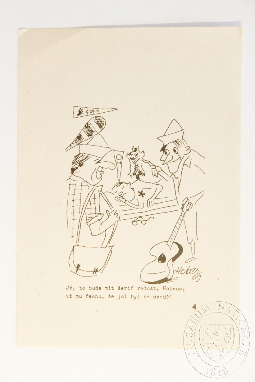 Reprodukce kresleného trampského vtipu signovaného "Hoban 69", dole s číslem (4). Na kresbě jsou tři trampové, jeden spí pod vlajkou osady Ajax, dole text "Jé, to bude mít šerif radost, Hobane, až mu řeknu, že jsi byl na osadě!".