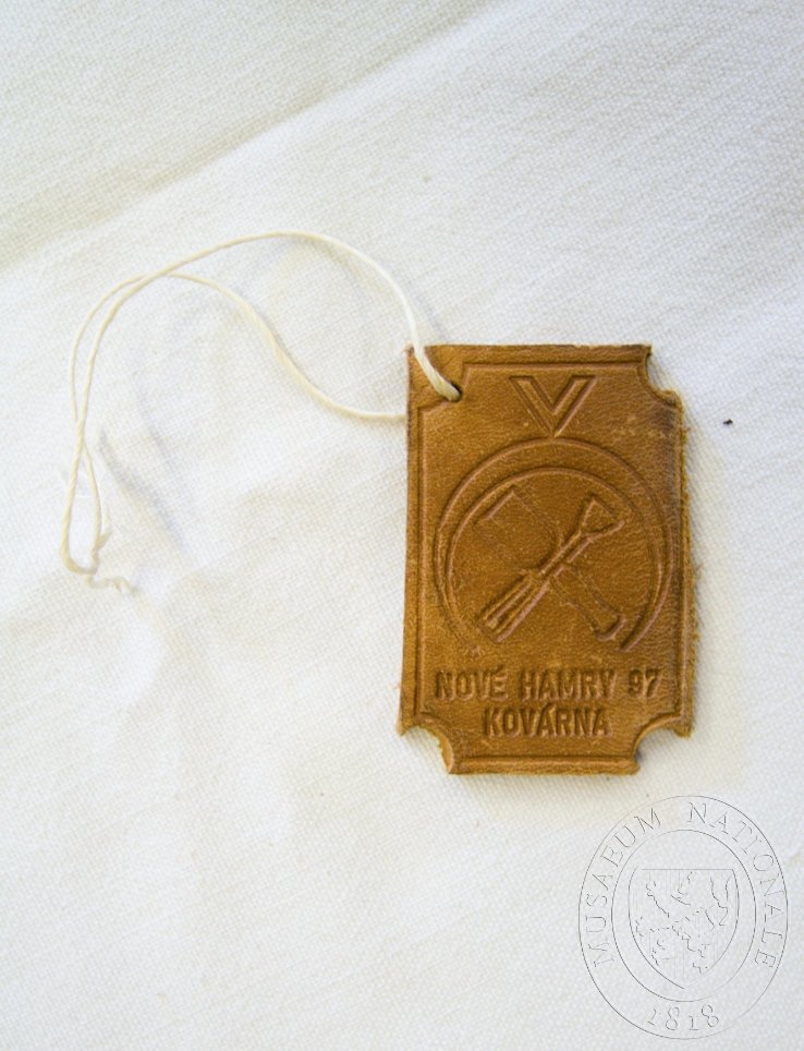 Camrátko kožené obdélné, se třemi vykousnutými rohy, poutko z provázku. Na přední straně je motiv řezbářských nástrojů v půlměsíci s háčkem, pod nimi nápis "Nové Hamry 97 Kovárna".