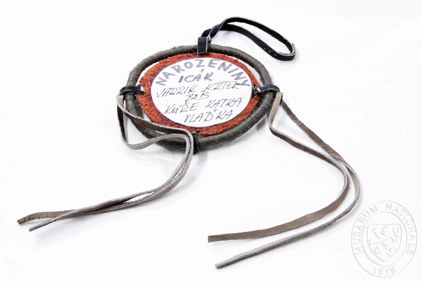 Kožené camrátko v podobě lapače snů, nahoře poutko ke zavěšení, po stranách třáseň. Na jedné straně bílý štítek s nápisem "Narozeniny Icák Varrik Krtek Bob Kuře Katka Vlaďka", na druhé straně terčovitý modrobílý štítek s nápisem "Chvojnice 1998".