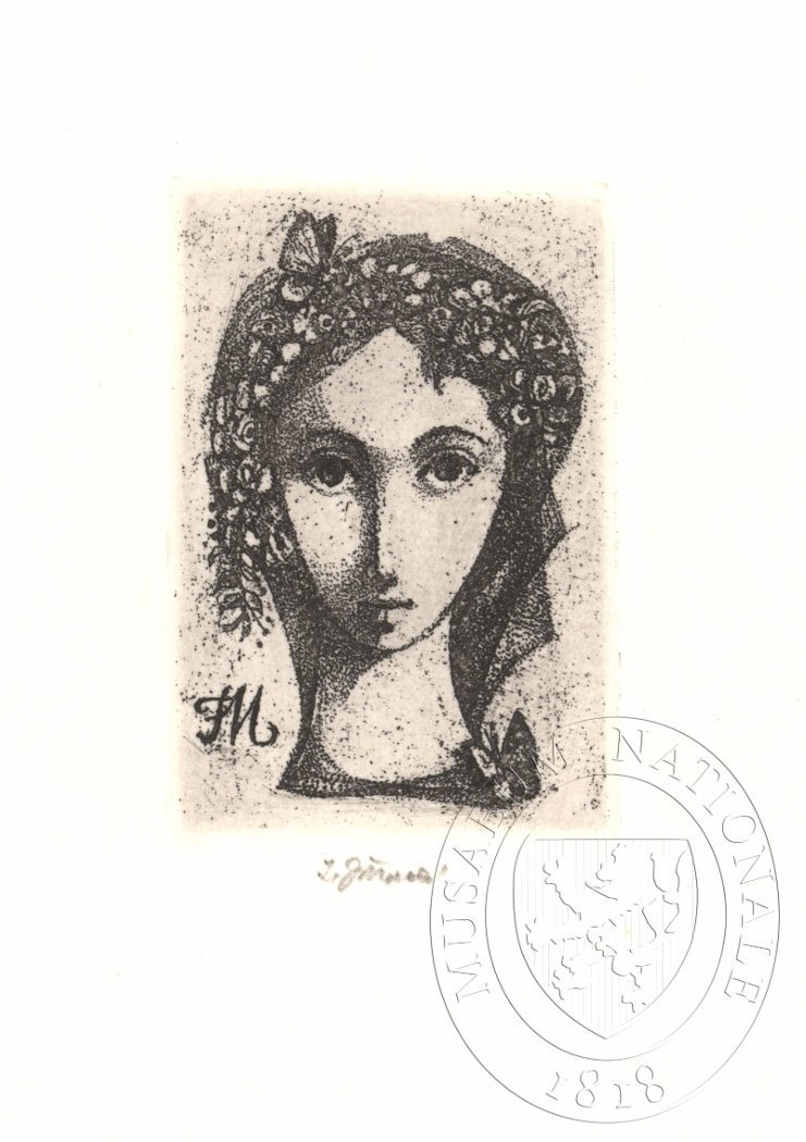 JIŘINCOVÁ, LUDMILA Hlava dívky s motýly, písmena FM. Exlibris František Másler.