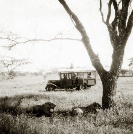 Auto výpravy knížete Schwarzenberga projíždí kolem lvů, odpočívajících pod stromem