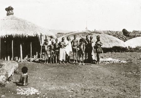 Skupina obyvatel vesnice před kruhovou chýší, Gišu (Mugišu, Bagišu)