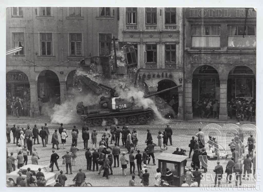 Ze souboru Fotocentrály Liberec - pohled na východní stranu nám. Bojovníků za mír (nyní Dr. E. Beneše) z vyššího patra některého z domů na záp. straně, tank č. 314 vojsk Varšavské smlouvy projíždějící podél východní strany nám. ve směru od Sokolovské ul. naráží do sloupů v podloubí domů č. 4 a 5 (tehdejší sídlo Fotografie); pod podloubím lidé utíkají od místa nárazu; v prostoru před radnicí přihlížející lidé, blíže do vozovky příslušníci VB; napravo několik motocyklů, zcela vlevo osobní automobil Trabant. Z fotoreportáže havárie tanku 21. 8. 1968 v 11.30 hod., oběťmi havárie se stali V. Březina a M. Čížek.