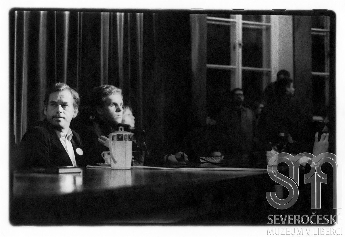 Ze souboru Sametová revoluce - v popředí vlevo tři postavy sedící za stolem, první zleva Václav Havel, vpravo v pozadí skupina posluchačů. Snímek je z besedy Václava Havla se studenty Přírodovědné fakulty UK Praha na Albertově v Purkyňově ústavu. Na reversu razítko autora.