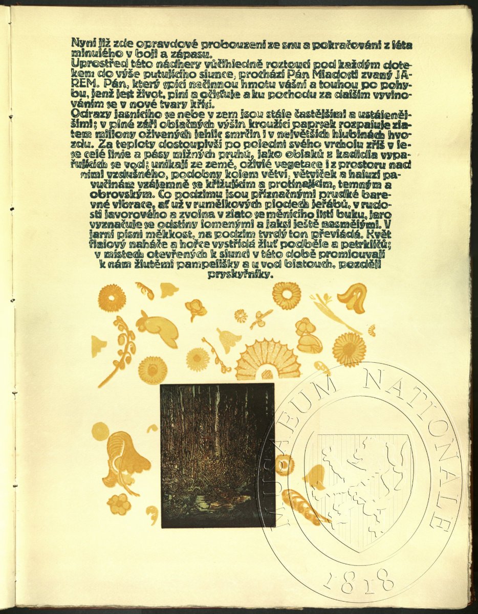Strana z autorské knihy J. Váchala Šumava, řazení stran zachováno dle předlohy, bez paginace. Ilustrace "Lesní tůň".