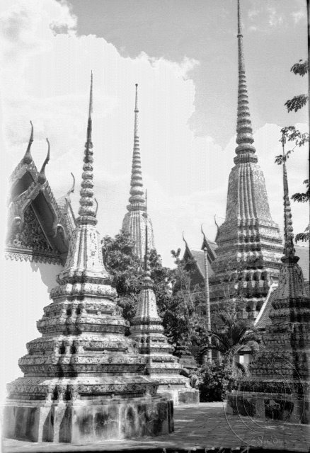Stúpy v chrámu Wat Phra Kaeo, Bangkok, čb film 6 x 9 cm.