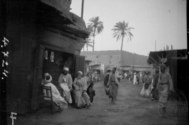 Ruch na tržišti - muži sedící před krámkem, Bagdád, čb film 6 x 9 cm.