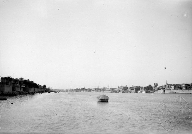 Pohled na řeku Tigris protékající Bagdádem, Bagdád, čb film 6 x 9 cm.