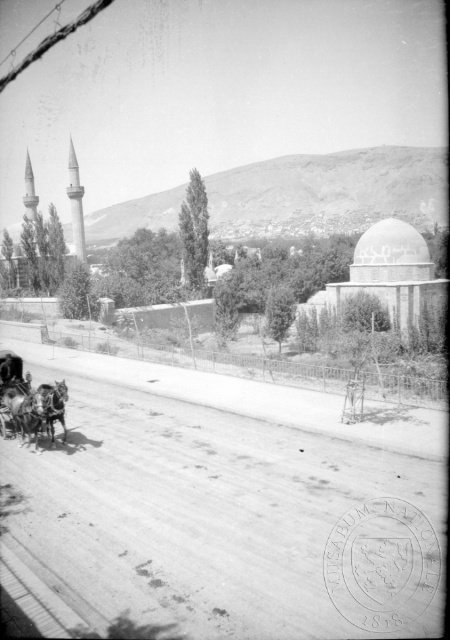 Sulejmanova mešita a pohled na kurdskou čtvrť Salhíja, Damašek, čb film 6 x 9 cm.