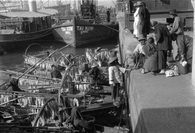 Čluny naložené rybami zakotvené u nábřeží (jiný záběr), čb film 6 x 8 cm.