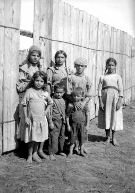 Skupina dětí stojících u prkenné ohrady - chailarští cikáni, Chailar (Chulun), čb film 6 x 8 cm.