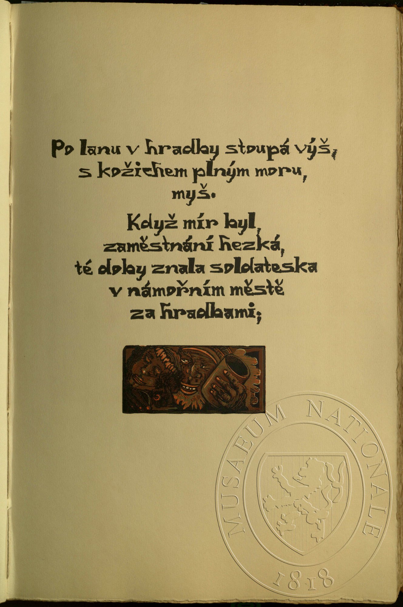 Strana z autorské knihy J. Váchala Corcyra Nigra - Mor v Korčule. Řazení stran zachováno dle předlohy, bez paginace. Barevná ilustrace.