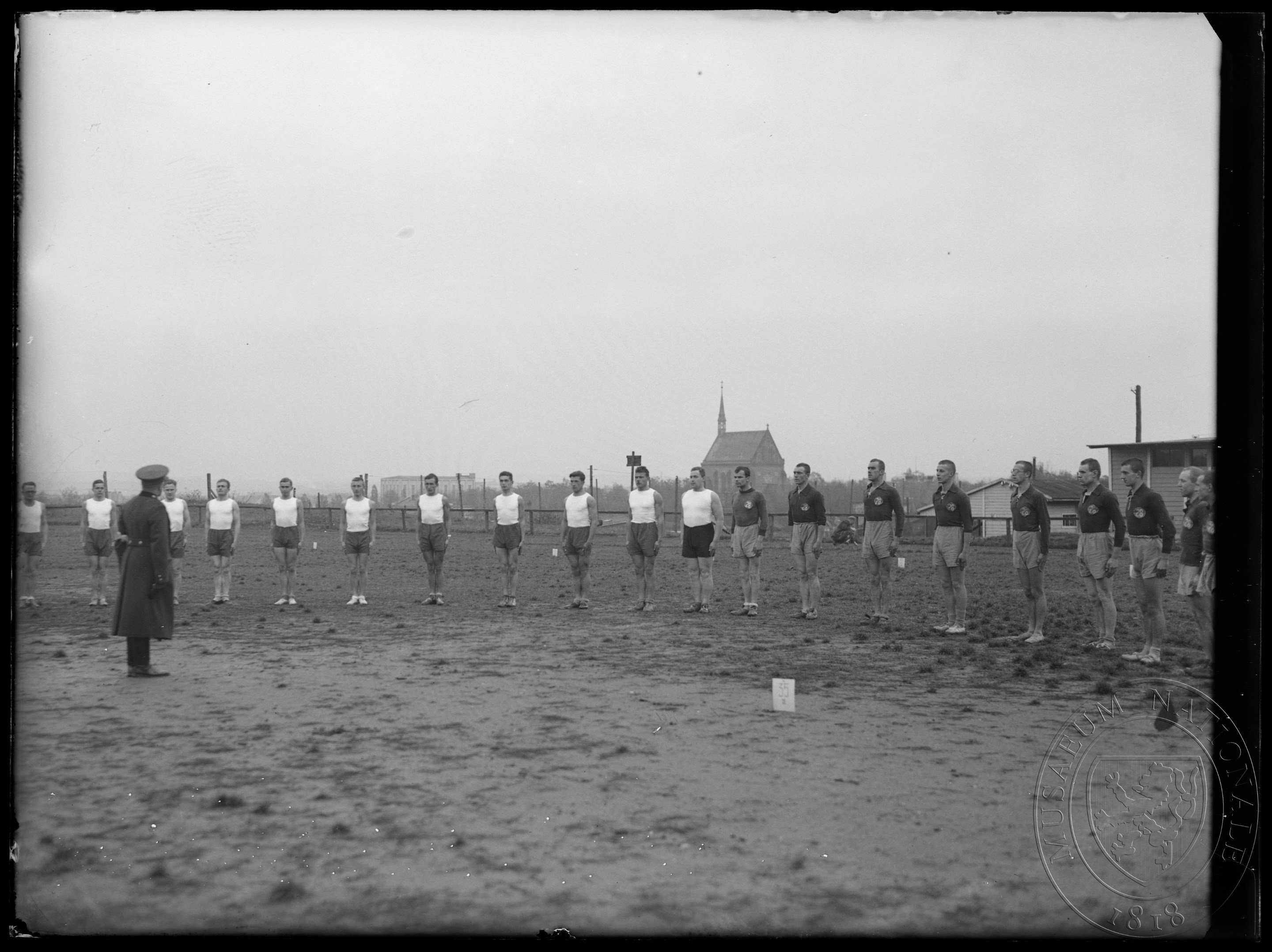 Utkání vojínů zdravotnické služby s vojíny 28. pěšího pluku ve Strašnicích, nástup