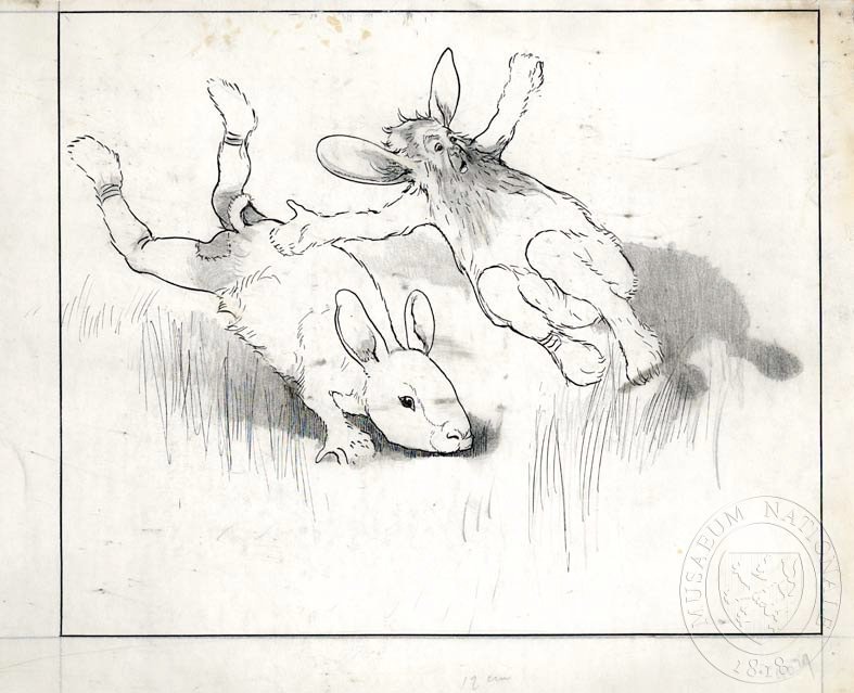 SCHEINER, ARTUŠ /Dva trpaslíci proměnění v králíky/ Ilustrace. Tisovský, T. E.: Král Myška a princ Junák : Příhody statečných trpaslíků. Praha : Šimáček, 1905.