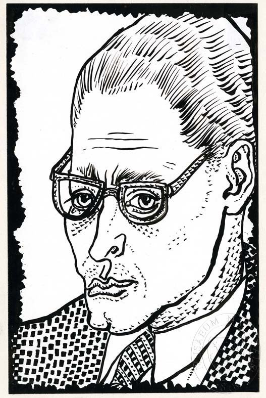 HOŘÁNEK, JAROSLAV /Portrét muže s brýlemi/ Novinová ilustrace. Sachse, H. K.: Kocour a já. Lidová demokracie 41, 1985. Připraveno k vydání, nezařazeno.