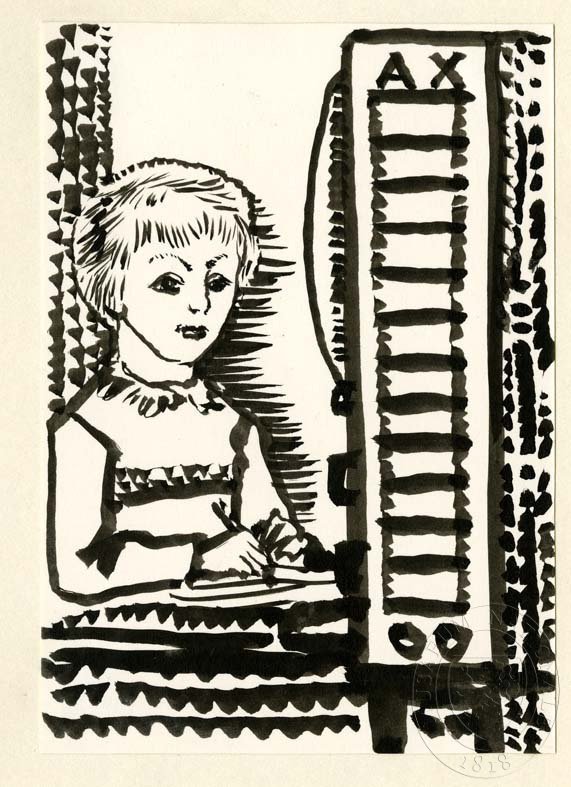 HOŘÁNEK, JAROSLAV /Píšící chlapec/ Novinová ilustrace, předloha pro tisk černou barvou. Asimov, I.: Správná kniha. Lidová demokracie 36, 1980. Připraveno k vydání, nezařazeno.