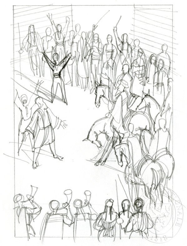 KUDĚLKA, MICHAL /Družina moravských jezdců přijíždějící na Děvín./ Studie k ilustraci ke 4. kapitole 2. dílu. Štorch, Eduard: Na Děvíně. In: O Děvín a Velehrad. Praha : Olympia, 2000.