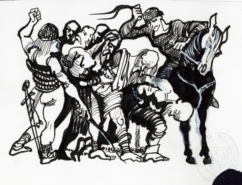 KUDĚLKA, MICHAL /Zajatí Slované/ Studie k ilustraci. Štorch, Eduard: Zkouška síly. In: Meč proti meči. Praha : Olympia, 2001.