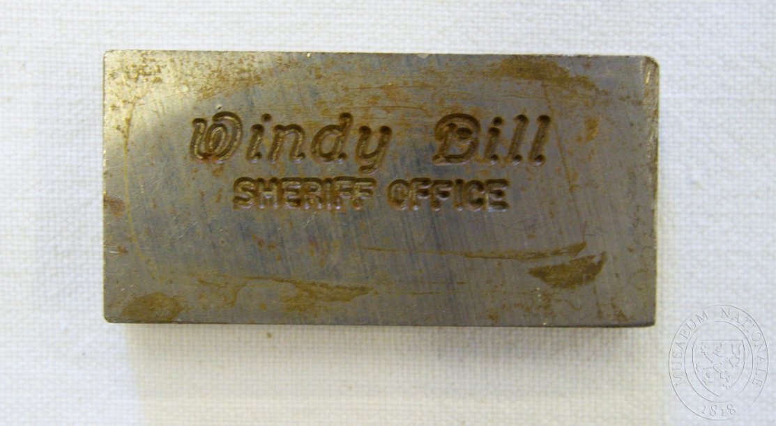 Matrice na razítko. Obdélná, kovová, s nápisem "Windy Bill Sheriff office".