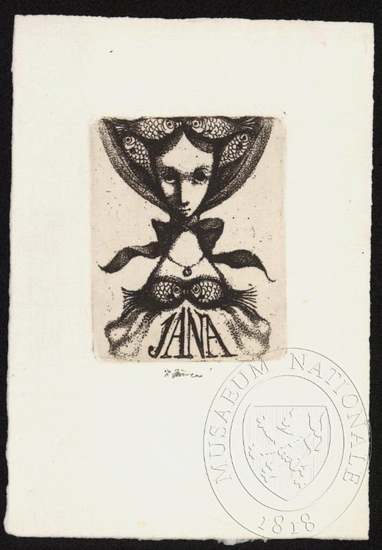 JIŘINCOVÁ, LUDMILA Hlava v klobouku z rybiček, text Jana. Exlibris Jana Pomyjová.