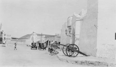 Pohled na čelní stranu paláce s historickými děly a bránou