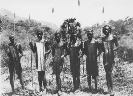 Muži se štíty a oštěpy stojící v řadě, Dinkové