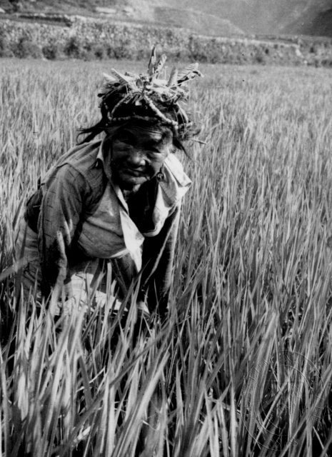 Stařena při práci na rýžovém poli, má pokrývku hlavy z listí, Igoroté, oblast Bontok, čb film 3 x 4 cm.