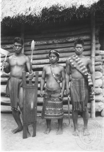 Žena stojící mezi dvěma muži - jeden drží oštěp a štít, Igoroté, Lubuagan, čb film 6 x 9 cm.