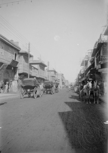 Rušná ulice New Street s kočáry, lemovaná domy s arkýřovými verandami, Bagdád, čb film 6 x 9 cm.