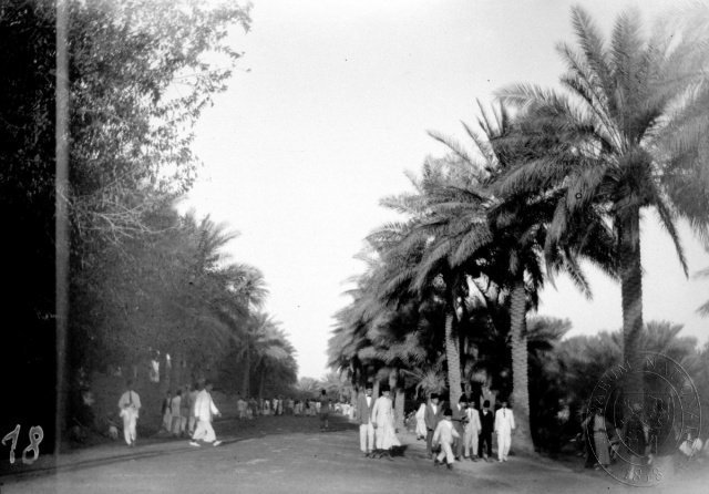Chodci na ulici lemované palmami, Bagdád, čb film 6 x 9 cm.