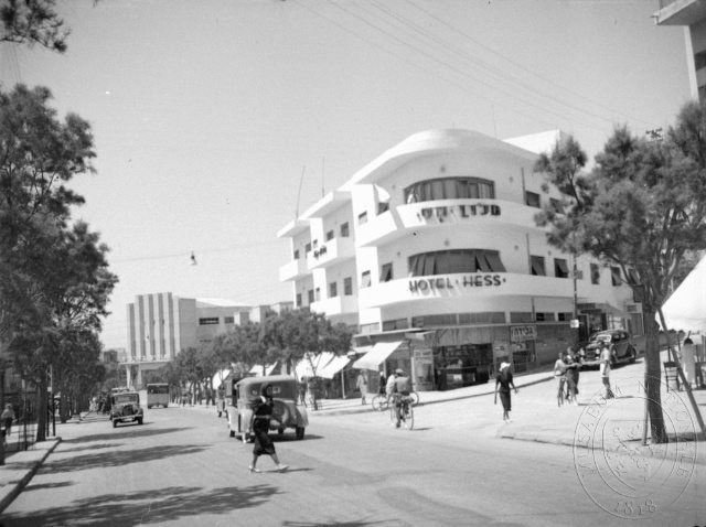 Moderní budova hotelu Hess, Tel Aviv, čb film 3 x 4 cm.