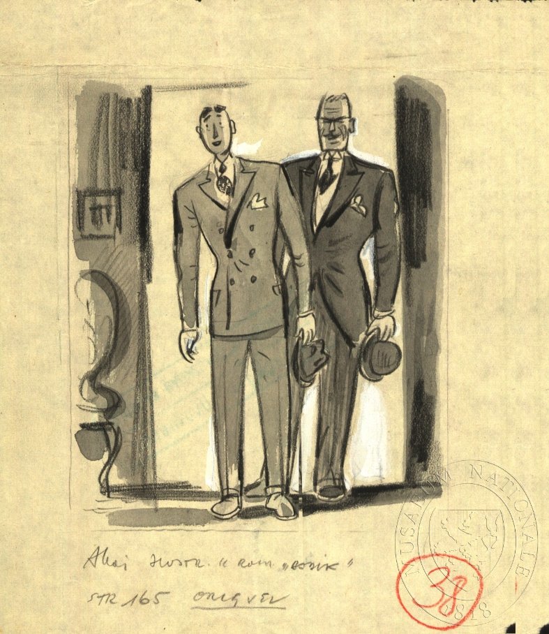 STEJSKAL, FRANTA /Dva muži ve dveřích/ Ilustrace. Bílý, Martin: Neviděli jste Bobíka? Praha : Alois Srdce, 1942. Pozn.: Na zadní straně razítko Obrázkové cenzury.