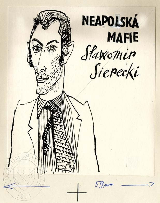 HOŘÁNEK, JAROSLAV /Muž v obleku, ručně tištěné a ručně psané písmo/ Novinová ilustrace, předloha pro tisk černou barvou. Sierecki, S.: Neapolská mafie. Lidová demokracie 35, 1979. Připraveno k vydání, nezařazeno.