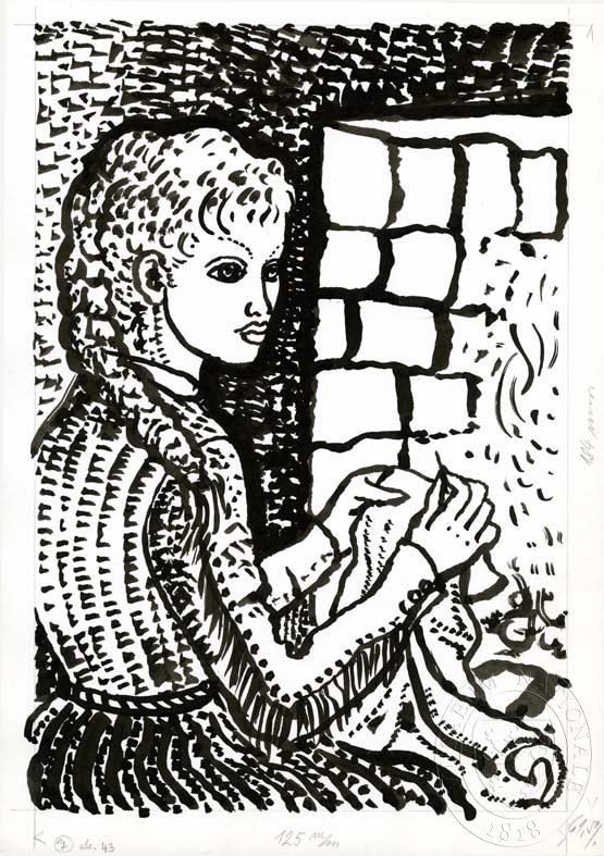 HOŘÁNEK, JAROSLAV /Tia zašívající prádlo před krbem/ Ilustrace pro 4. kapitolu. Pélot, P.: Dlouhý lov. Praha: Albatros, 1990. Edice Knihy odvahy a dobrodružství.