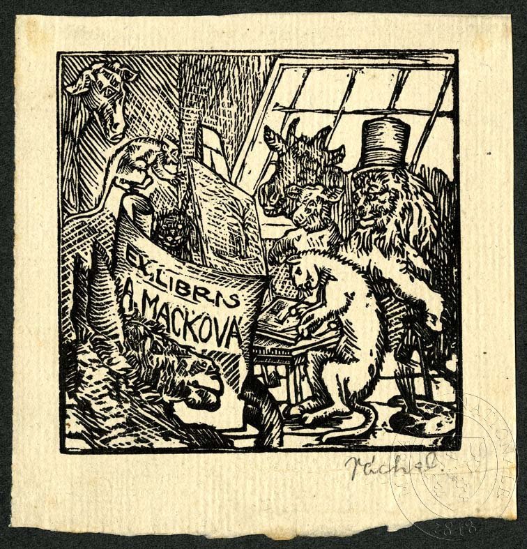 Exlibris. Zvířátka v ateliéru. EX LIBRIS A. MACKOVÁ.