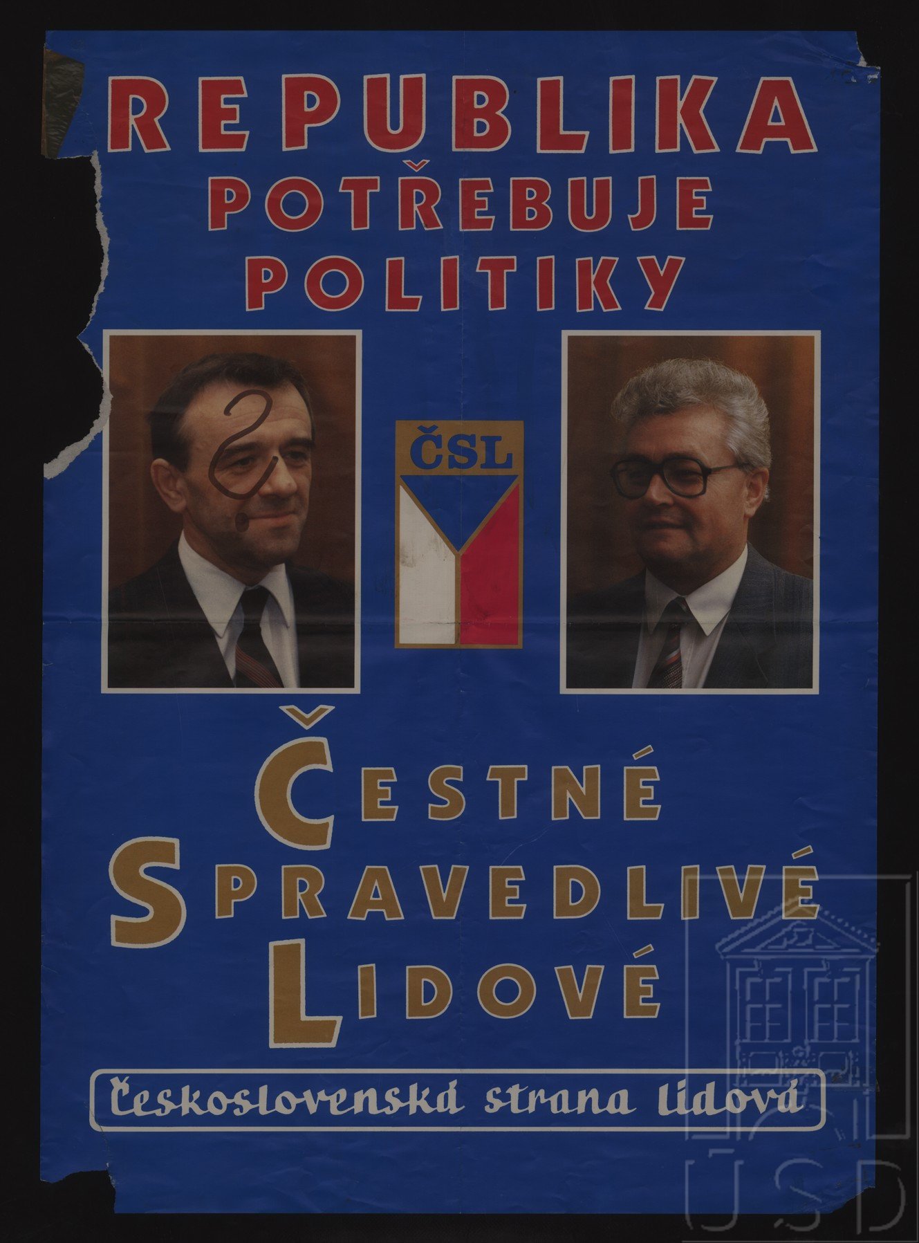 Volební plakát, Československá strana lidová, „Republika potřebuje politiky čestné, spravedlivé, lidové,“ popsaný a poškozený