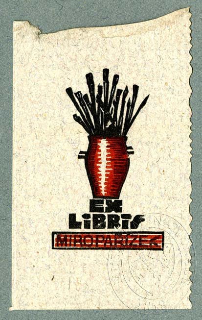 Exlibris. Džbán se štětci. EX LIBRIS MIRO PAŘÍZEK. Ipse sibi.