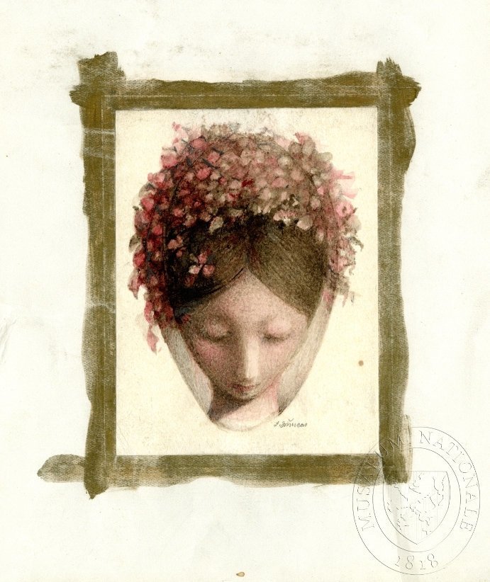 JIŘINCOVÁ, LUDMILA /Dívčí hlava s růžovými květy/ Ilustrace. Seifert, Jaroslav: Jaro, sbohem. Praha : Československý spisovatel, 1985. Edice Pegas. Klub přátel poezie. Výběrová řada.